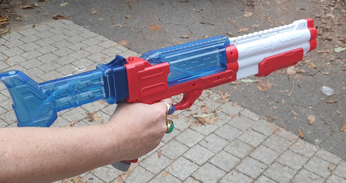 В этот момент к нам пришла иностранная помощь от нашего наиболее вероятного союзника. На Новый Год наша военщина поставила нам наступательное вооружение для борьбы с Нухбой. Маловысоколетальное, но якобы достаточно эффективное для отражения атак. При unboxing'e выяснилось, что оружие китайского производства со всеми инструкциями исключительно по-китайски, но что еврею китайский, если он иврит выучил! (Были некие мелкие проблемы, в частности, аккумулятор вместе с проводами никак не влезал в предназначенный для неё магазин, но при помощи колена и монтировки удалось впихнуть, а изготовители обещают, что одной зарядки хватит на всю войну, могу даже поверить в это). Тактические проблемы выявились только после боевых стрельб по Нухбе. Оказалось, что эта сволочь, удирая, бежит быстрее скорости струи, выбрасываемой безлимитной китайской батарейкой. Т.е., стрелять Нухбе вслед, пытаясь преподать ей (ему) урок deterrence, бессмысленно. В какой-то момент, забыв знания из восьмого класса 179-й с.ш., я попытался накрыть Нухбу настильной стрельбой, повышая угол возвышения (и тем самым уменьшая горизонтальную скорость снаряда), но вовремя одумался.
