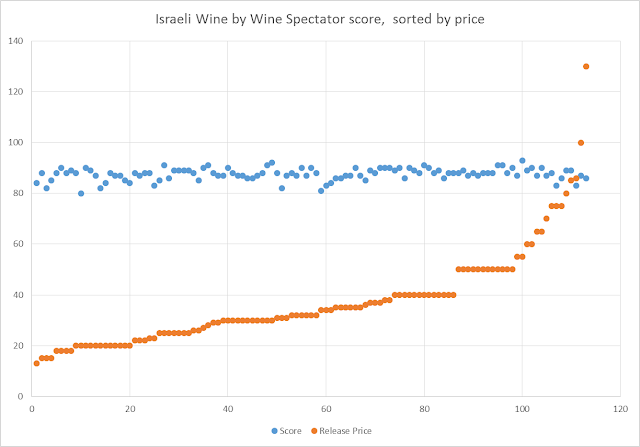 Корреляция между ценой израильских вин в долларах в Америке (оранжевые точки) и их оценкой по стобалльной шкале. Наверное, хеломские цены в шекелях достаточно точно пропорциональны американским, так что перемасштабировать горизонтальную ось, досуг имея, сумеет всяк.Мораль: в диапазоне от 30 и до 300 шекелей за бутылку качество (и без того субъективная вещь) малопредсказуемо колеблется в диапазоне от 80 до 90.